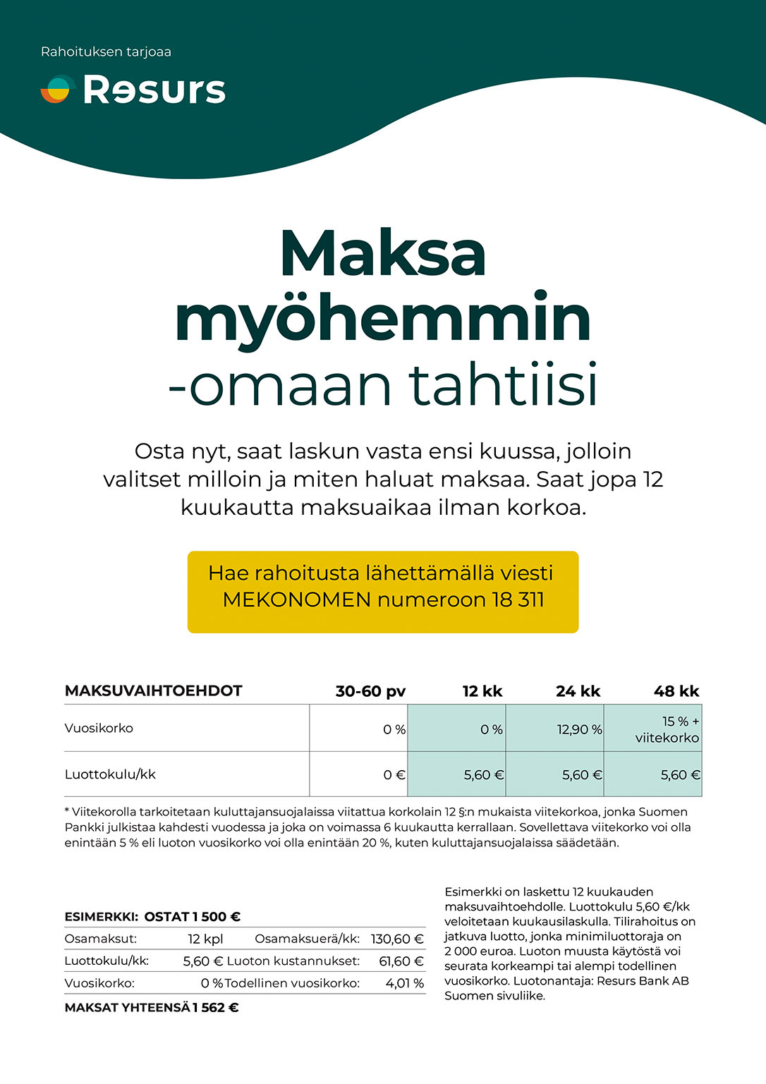 Esimerkkiostos: 1 500 €, 12 kk maksuvaihtoehdolla. Vuosikorko: 0 %. Luottokulu/kk: 5,60 €. Todellinen vuosikorko: 4,01 %. Luoton kustannukset: 61,60 €. Maksettava yhteensä: 1 561,60 €. Osamaksuerä/kk: 130,60 €, 12 erää. Mekonomen Rahoitus on jatkuva luotto, jonka minimiluottoraja on 2 000 €. Luoton muusta käytöstä voi seurata korkeampi tai alempi todellinen vuosikorko. Luotonantaja: Resurs Bank AB Suomen sivuliike. Lisätietoa Mekonomen Rahoituksesta saat tästä.