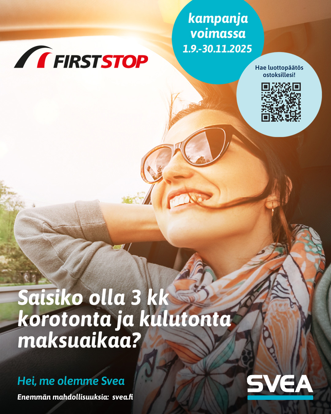 Saat Svea laskulla kampanja aikana 90 päivää ja muulloin 30 päivää korotonta ja kulutonta maksuaikaa renkaisiin, vanteisiin ja autohuoltoihin.